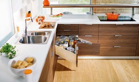 櫥柜設(shè)計時應(yīng)注意操作臺的連續(xù)性, 方便老人操作。 這對坐輪椅者來說尤其重要, 他們可以通過在臺面上滑動推移鍋碗等炊具和餐具, 更加省力。