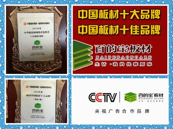 目前,百的寶已經(jīng)憑借良好的品牌形象和口碑享譽全國,推行的環(huán)保理念更是得到消費者一致的好評,連續(xù)兩屆蟬聯(lián)“中國板材品牌”實屬實至名歸!