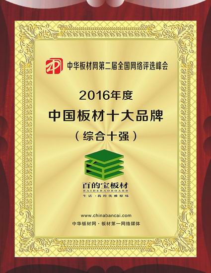 在此次權(quán)威評選中,百 的 寶憑借著專注做健康板材的匠心,強大的品牌實力和市場占有率獲得消費者和專業(yè)人士的一致認可,成功蟬聯(lián)“2016中國板材品牌”的榮譽稱號。