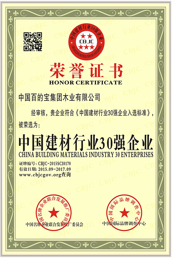 正是因為對質量的高要求,嚴把關,百的寶板材在每年市監管局組織的質量抽檢中次次合格。2015年9月中國名牌企業聯合發展推廣委員會、中國國際品牌調查中心檢測,授予中國百的寶集團木業有限公司“中國建材行業30強企業”榮譽稱號。